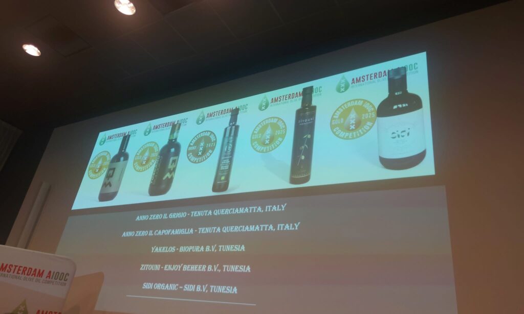 شاركت تونس يوم 12 جوان 2025 بكل فخر في حفل تتويج الزيوت الفائزة ضمن الدورة الرابعة من مسابقة أمستردام الدولية لزيت الزيتون (Amsterdam International Olive Oil Competition – AIOOC 2025)، التي أقيمت بالعاصمة الهولندية أمستردام. وقد سجّلت هذه التظاهرة الدولية الهامة تنافس 100 علامة تجارية من 17 دولة، من بينها تونس، ما يعكس البعد العالمي للمسابقة وأهميتها في قطاع زيت الزيتون.