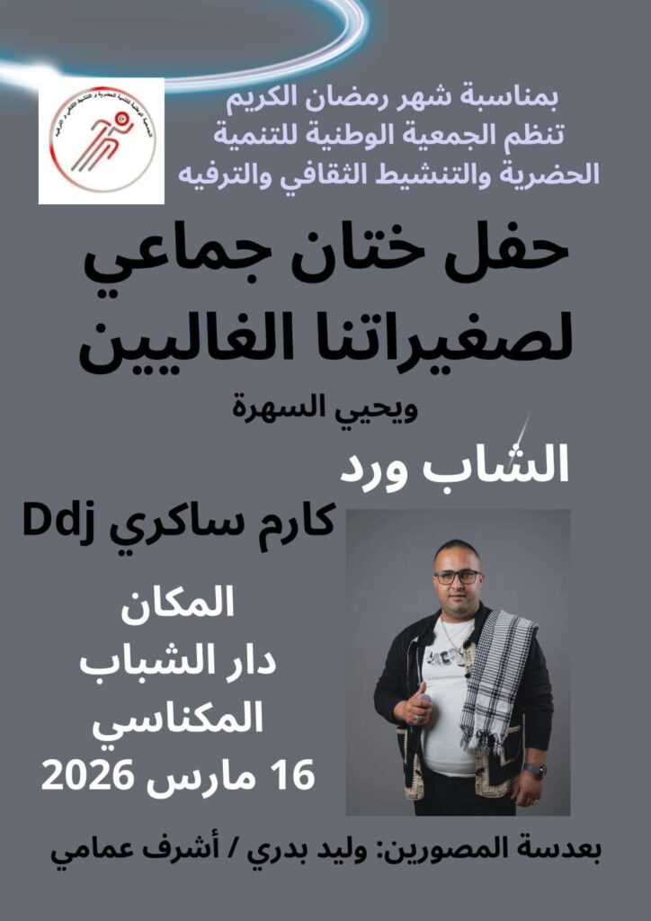 في بادرة إنسانية واجتماعية مميزة، تنظم الجمعية الوطنية للتنمية الحضرية والتنشيط الثقافي والترفيه برئاسة السيد أنور عليبي مساء ليلة 27 من شهر رمضان تظاهرة تضامنية بمدينة المكناسي، يتم خلالها ختان 10 أطفال من أبناء الجهة، وذلك بفضاء دار الشباب بالمكناسي.