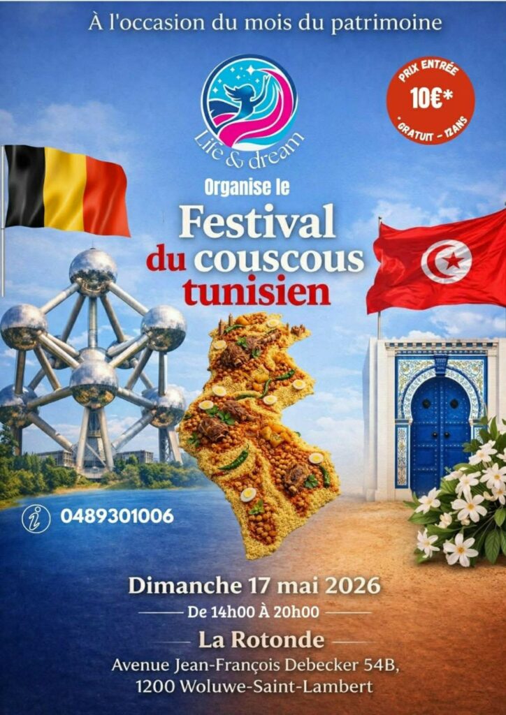 في إطار الاحتفال بشهر التراث، تستعد الجالية التونسية في بلجيكا لتنظيم حدث ثقافي مميز يتمثل في “مهرجان الكسكس التونسي”، وذلك يوم الأحد 17 ماي 2026، بفضاء “لا روتوند” الكائن ببلدية وولو-سان-لامبير.